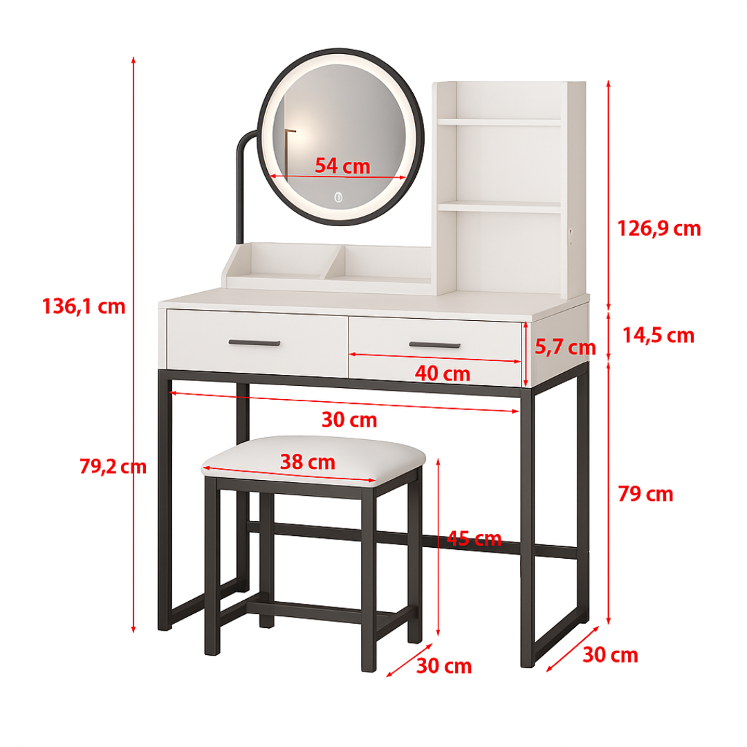 Adja meg a stílust és a funkcionalitást hálószobájában ezzel a modern fehér WC-asztallal. Fel van szerelve 360° forgó LED tükör 3 fénymóddal (felső sárga, meleg fehér, hideg fehér), amely tökéletes sminkvilágítást biztosít a nap minden szakában.